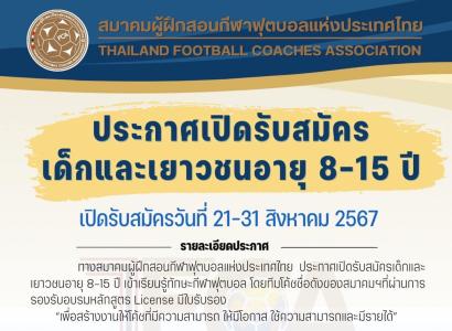 สมาคมผู้ฝึกสอนกีฬาฟุตบอลแห่งประเทศไทย เปิดรับสมัครนักเรียน ที่เรียนจบประถมศึกษาปีที่6 (ป.6) เข้าเรียนใน...