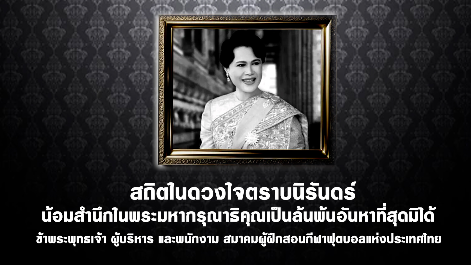 สถิตในดวงใจตราบนิรันดร์ น้อมสำนึกในพระมหากรุณาธิคุณเป็นล้นพ้นอันหาที่สุดมิได้ ข้าพระพุทธเจ้า ผู้บริหาร และพนักงาม สมาคมผู้ฝึกสอนกีฬาฟุตบอลแห่งประเทศไทย